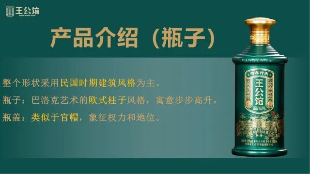 王公馆酒的 LOGO 整体形状取材于上世纪大上海大公馆,象征高贵、气派和深厚的文化底蕴;最上面的元素代表其历史渊源,使用的王氏一族图腾,以及最下面表示王茅世家起源元年的标识,每一处细节都诉说着品牌的传奇故事。正如父亲虽然不善言辞,但他的每一个举动、每一次默默支持,都在诉说着对我们无尽的爱。